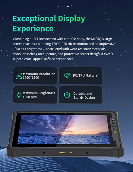 The ONErugged M105Q is a formidable rugged tablet PC engineered to conquer any task with AI-powered performance. Built by ONErugged, this 10.1-inch device leverages a top 5G mobile platform based on 6nm technology, featuring the Qualcomm Kryo 670 CPU and AI-accelerated Qualcomm Hexagon 770 processor. Running Android 14 (GMS certified), it delivers robust computational power for industrial IoT applications and diverse scenarios.