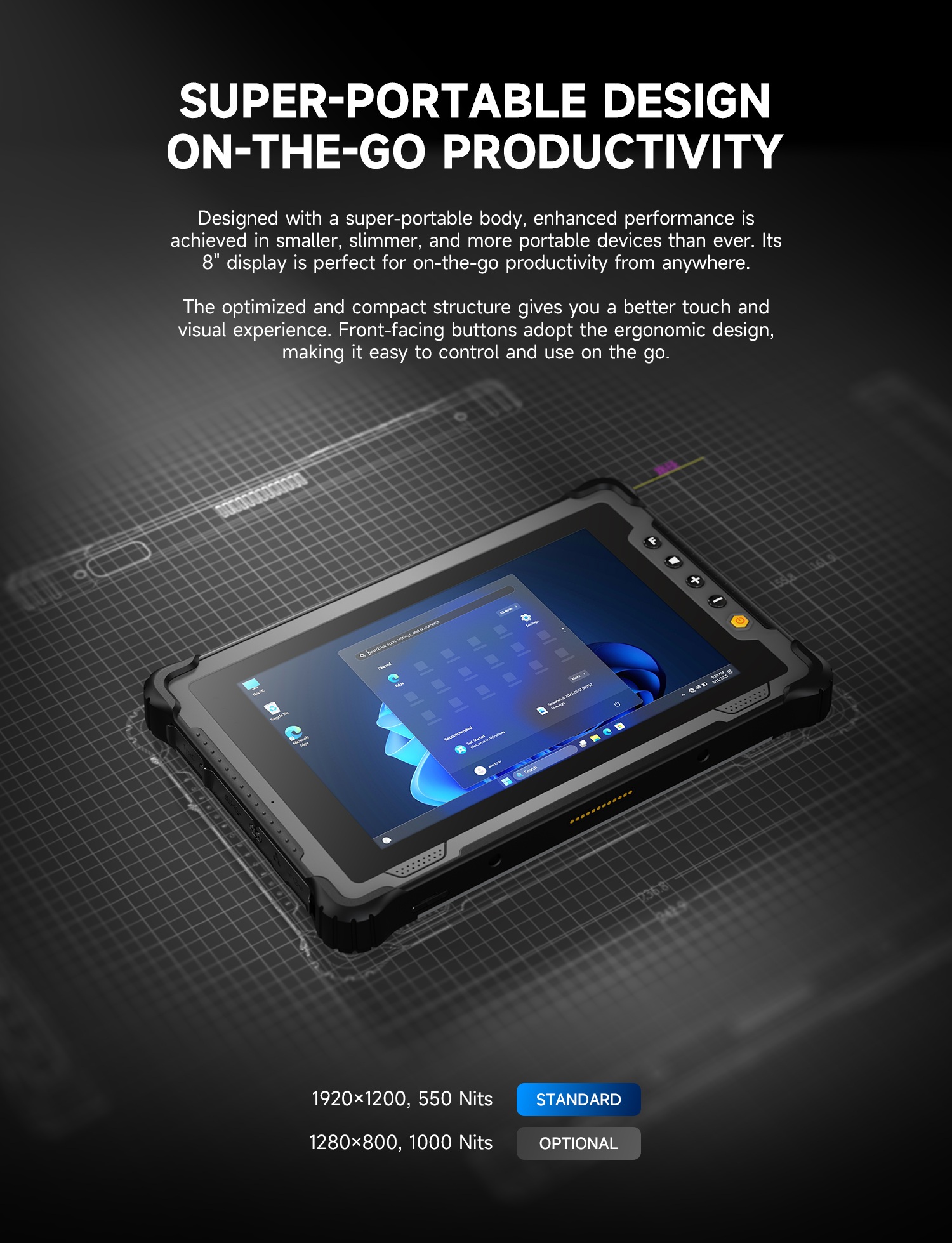Optional:8", HD (800x1280), 1000 Nits