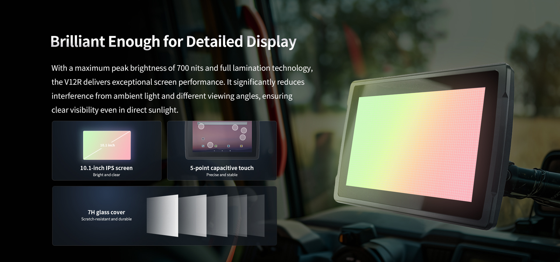 Powered by the Rockchip RK3568, it's an industrial-level processor tailored for automotive central control systems with high performance but low-power consumption. It effortlessly handles diverse in-vehicle applications, enhancing productivity and convenience. With a maximum peak brightness of 700 nits and full lamination technology, the V12R delivers exceptional screen performance. It significantly reduces interference from ambient light and different viewing angles, ensuring clear visibility even in direct sunlight.Designed to meet automotive-grade standards, the V12R effortlessly handles harsh environments with IP65 protection and ISO16750 road vehicle performance testing, ensuring resilience against dust, rain, and high vibrations.